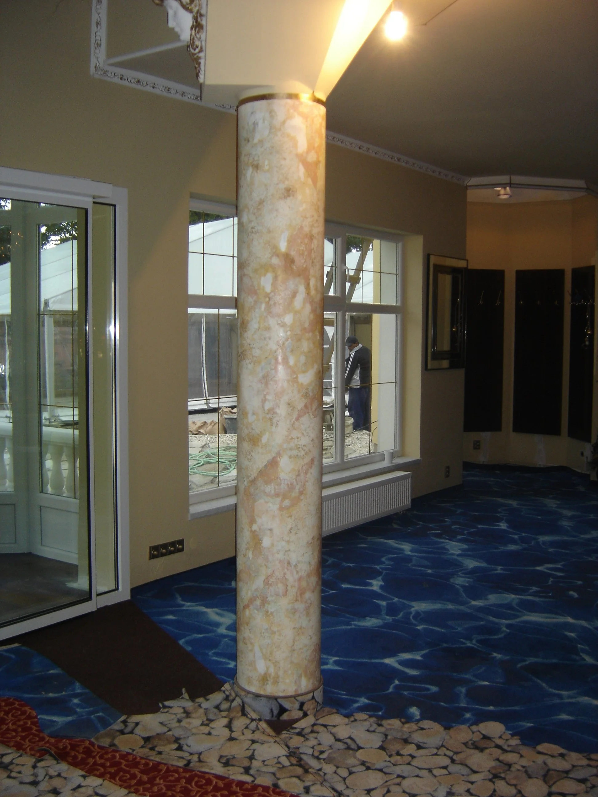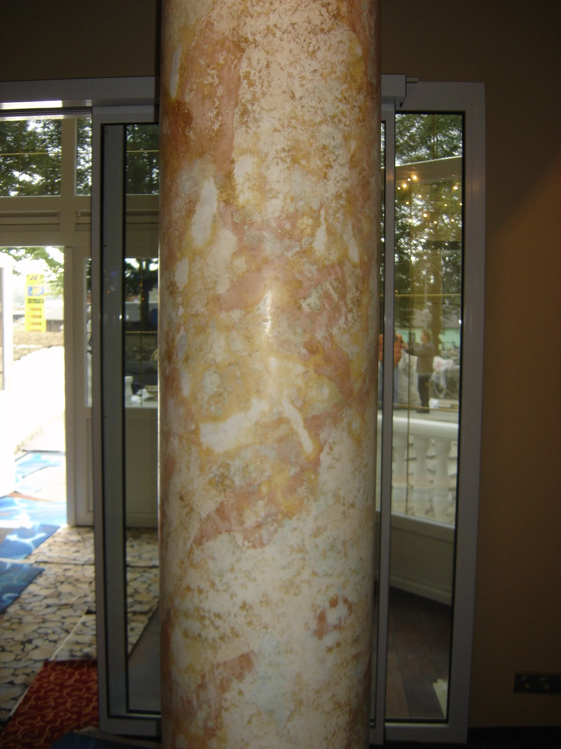 Nachbildung hochwertiger Materialien wie Marmor, Holz oder Metall durch Malerei u./o. Beschichtung. Diese Technik ermöglicht es, edle Optiken und mit flexibler Anpassung an den Raum zu realisieren.