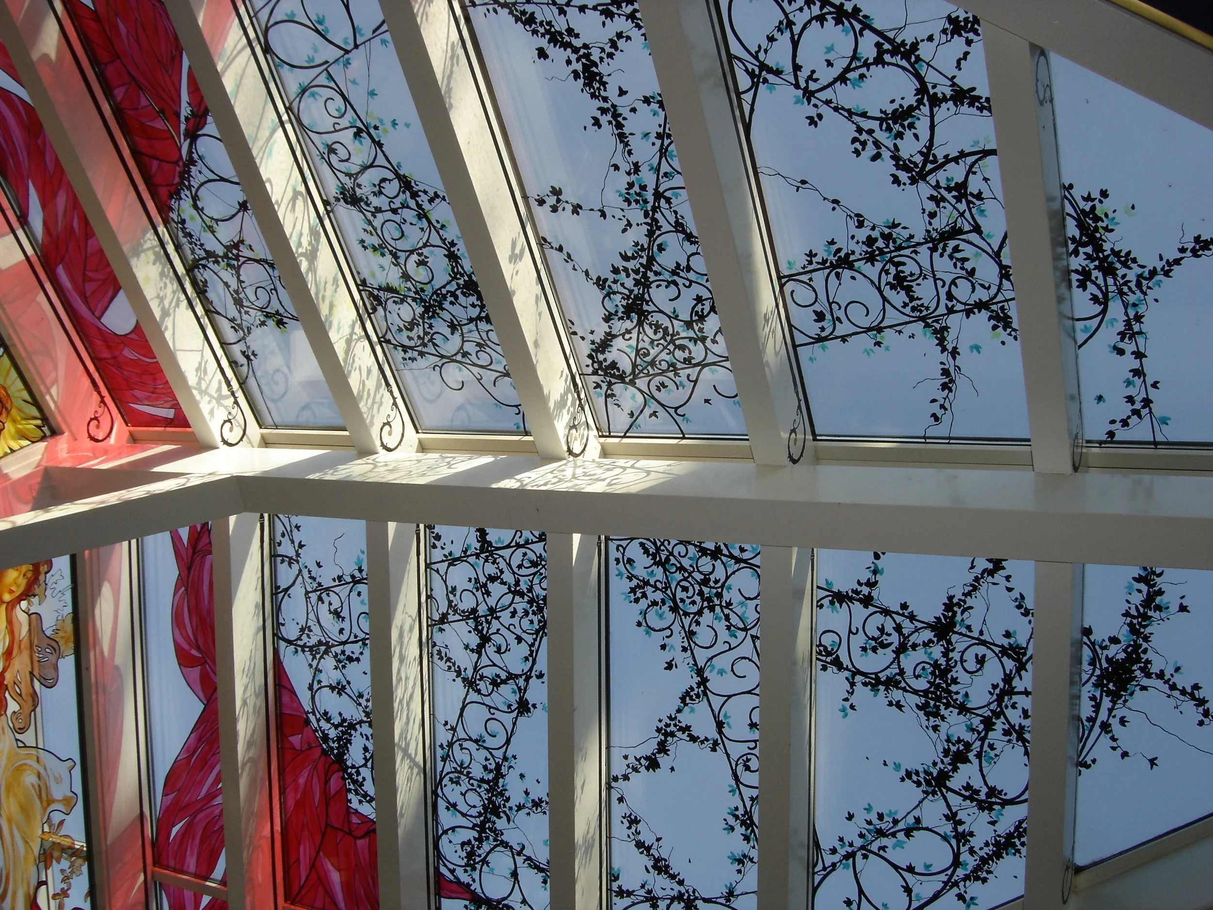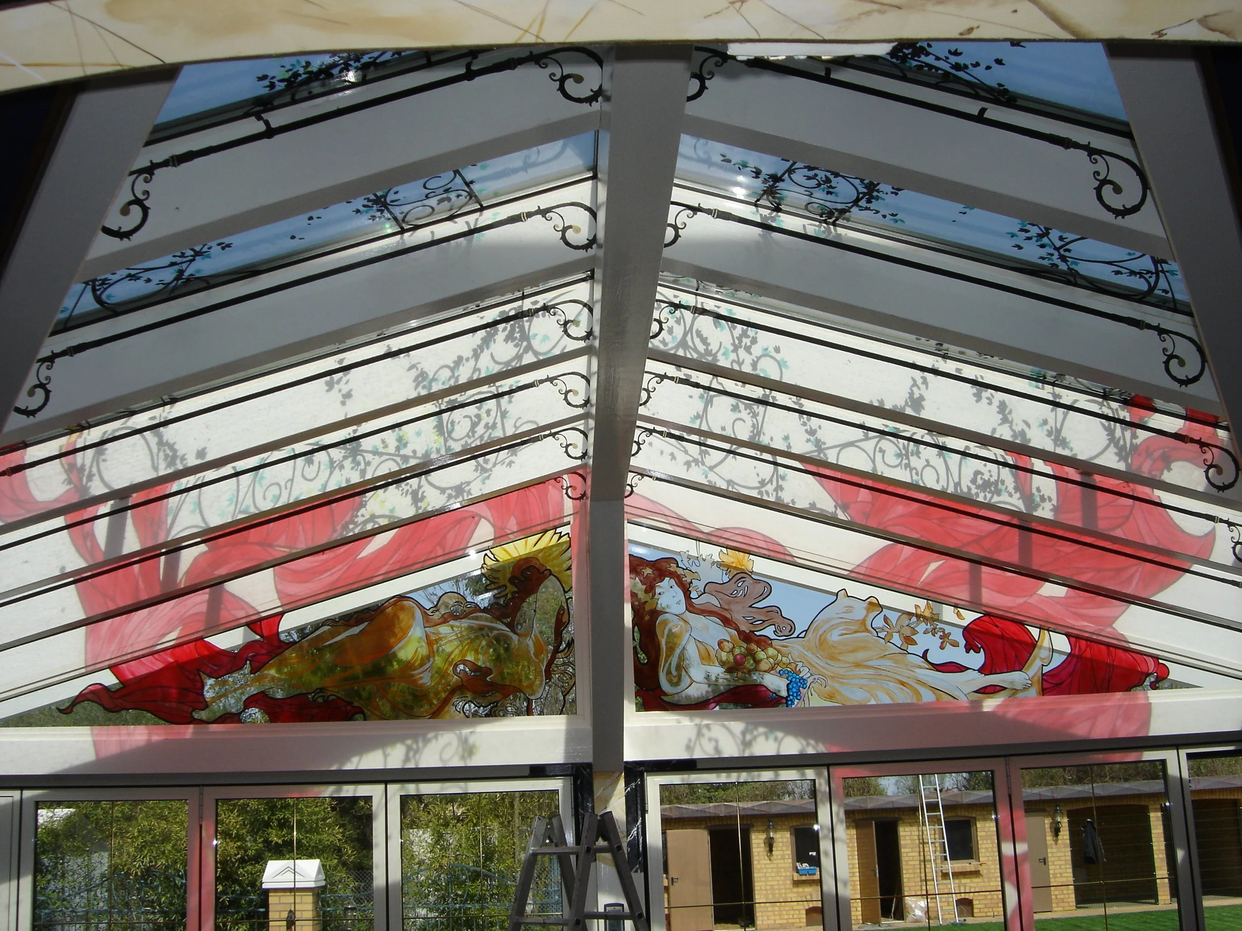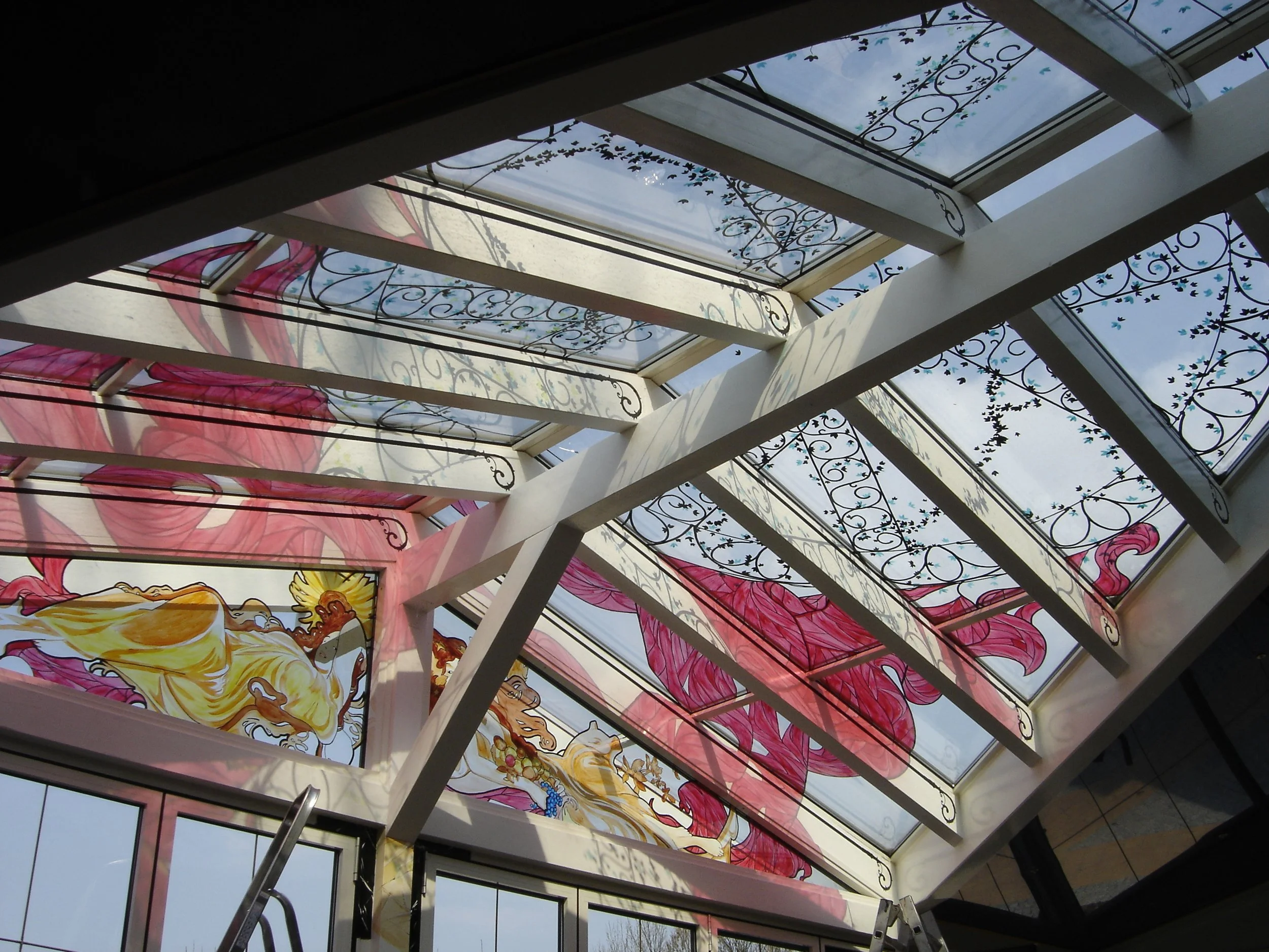 Verzierung von Glasflächen mit transparenten Farben, häufig in sakraler Kunst, moderner Architektur oder individuellen Kunstprojekten eingesetzt.