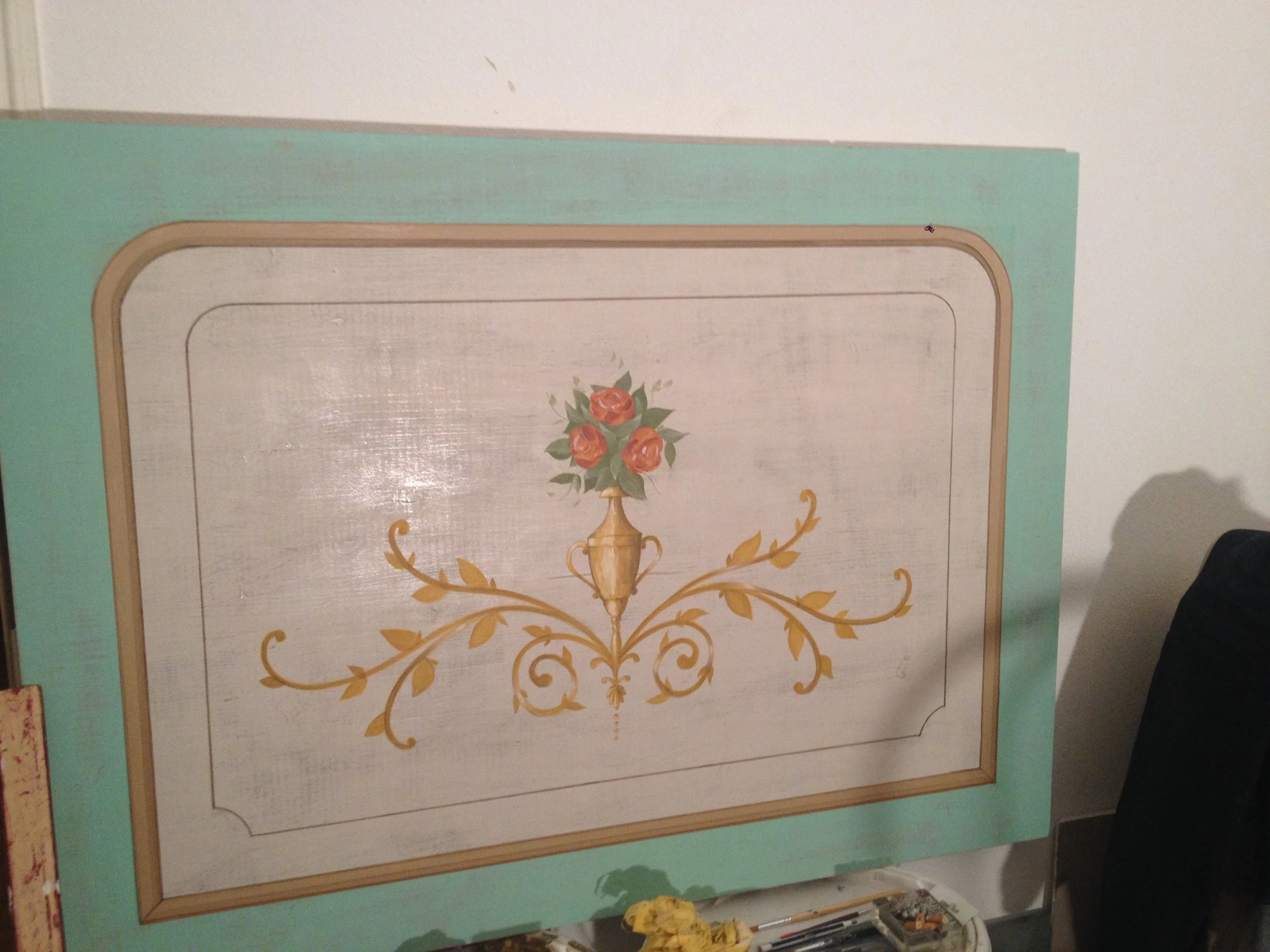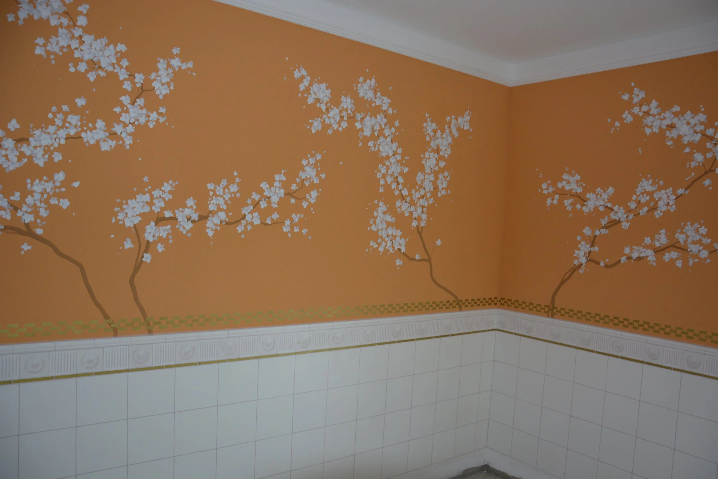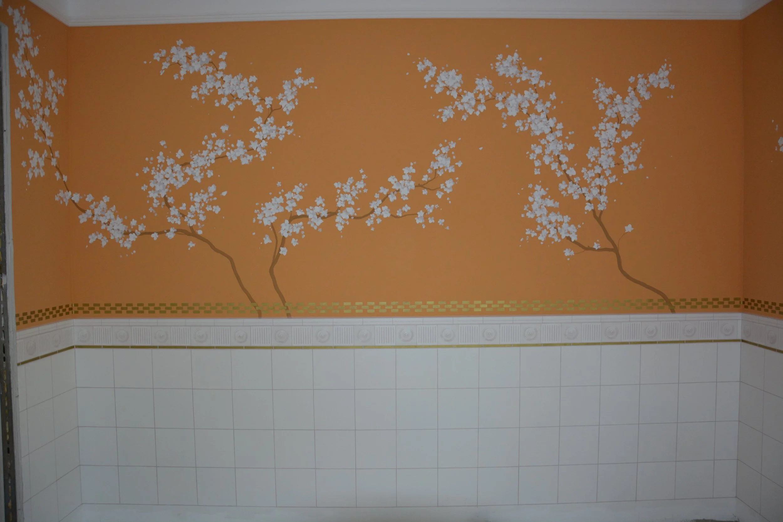 Wohnung (Lion, Frankreich), Bad, Wandmalerei, Apfelblüten, Fliesen gemalt, Blattgold