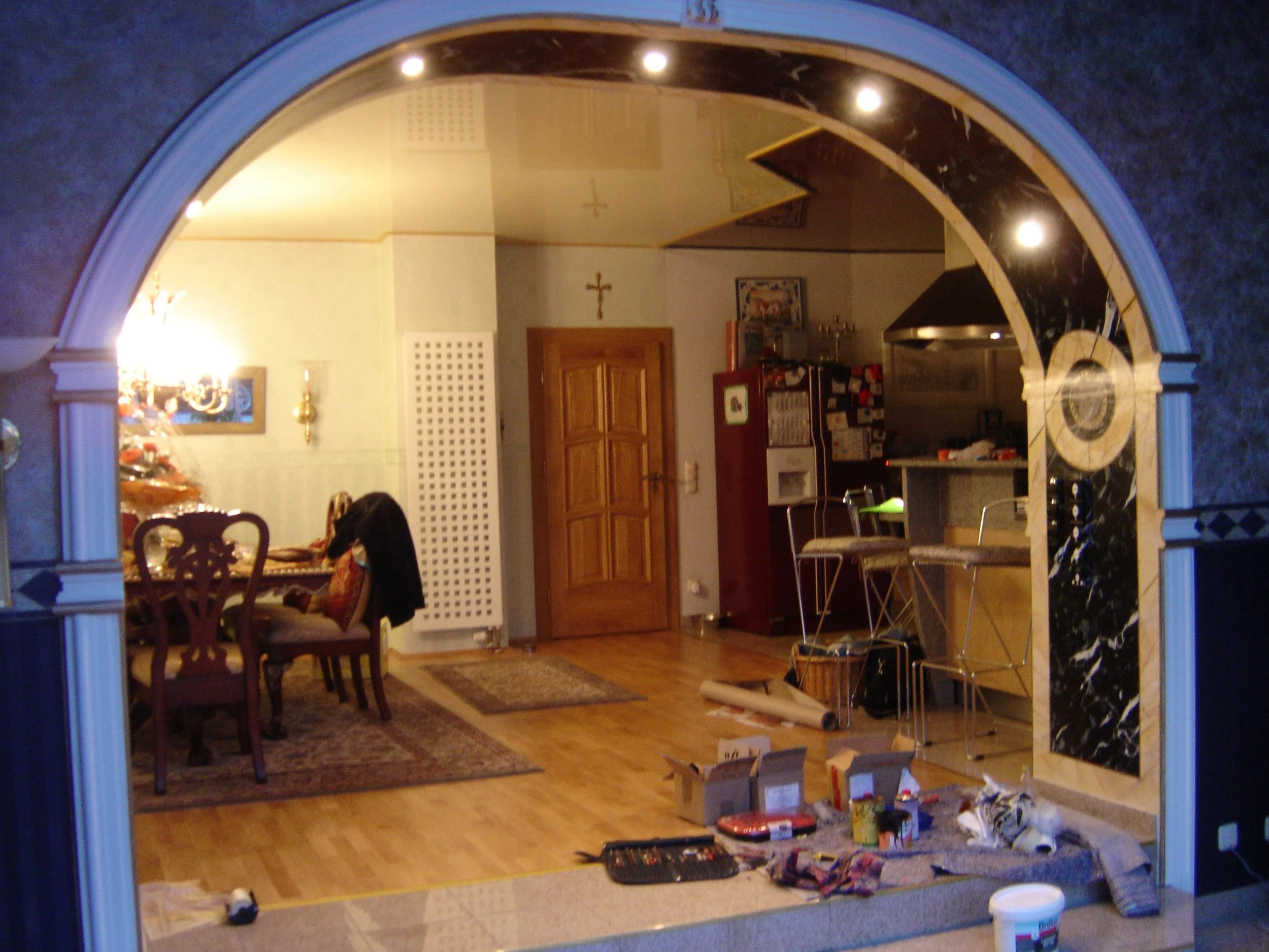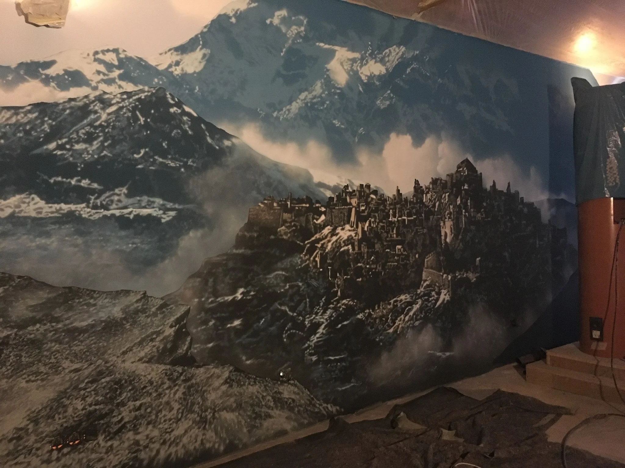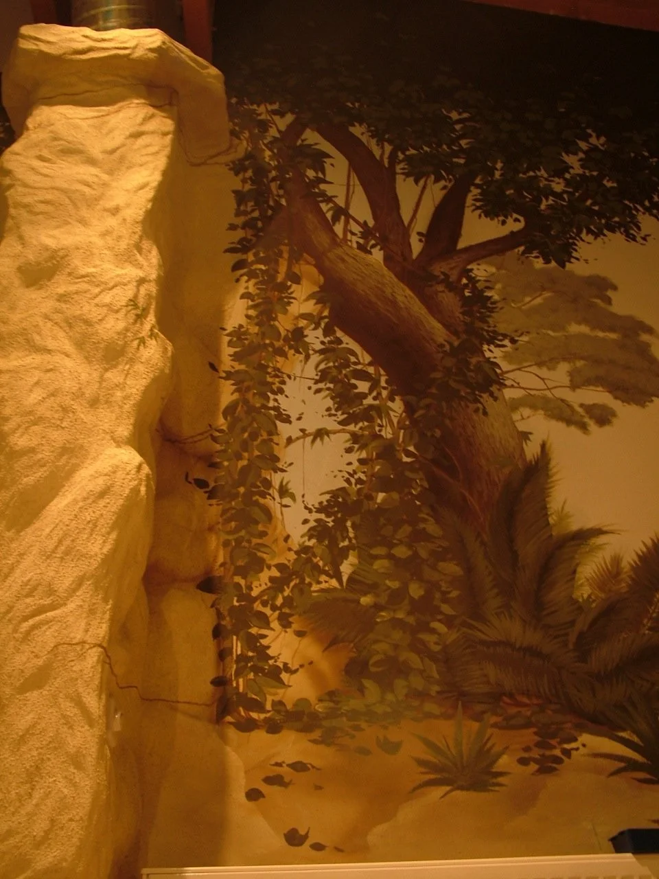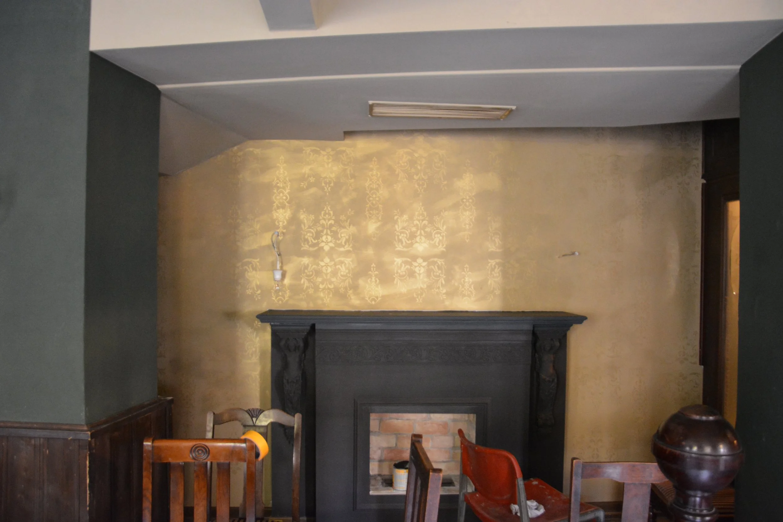 Tapete gemalt (gold), Kamin gebaut (Stuck eingefärbt)