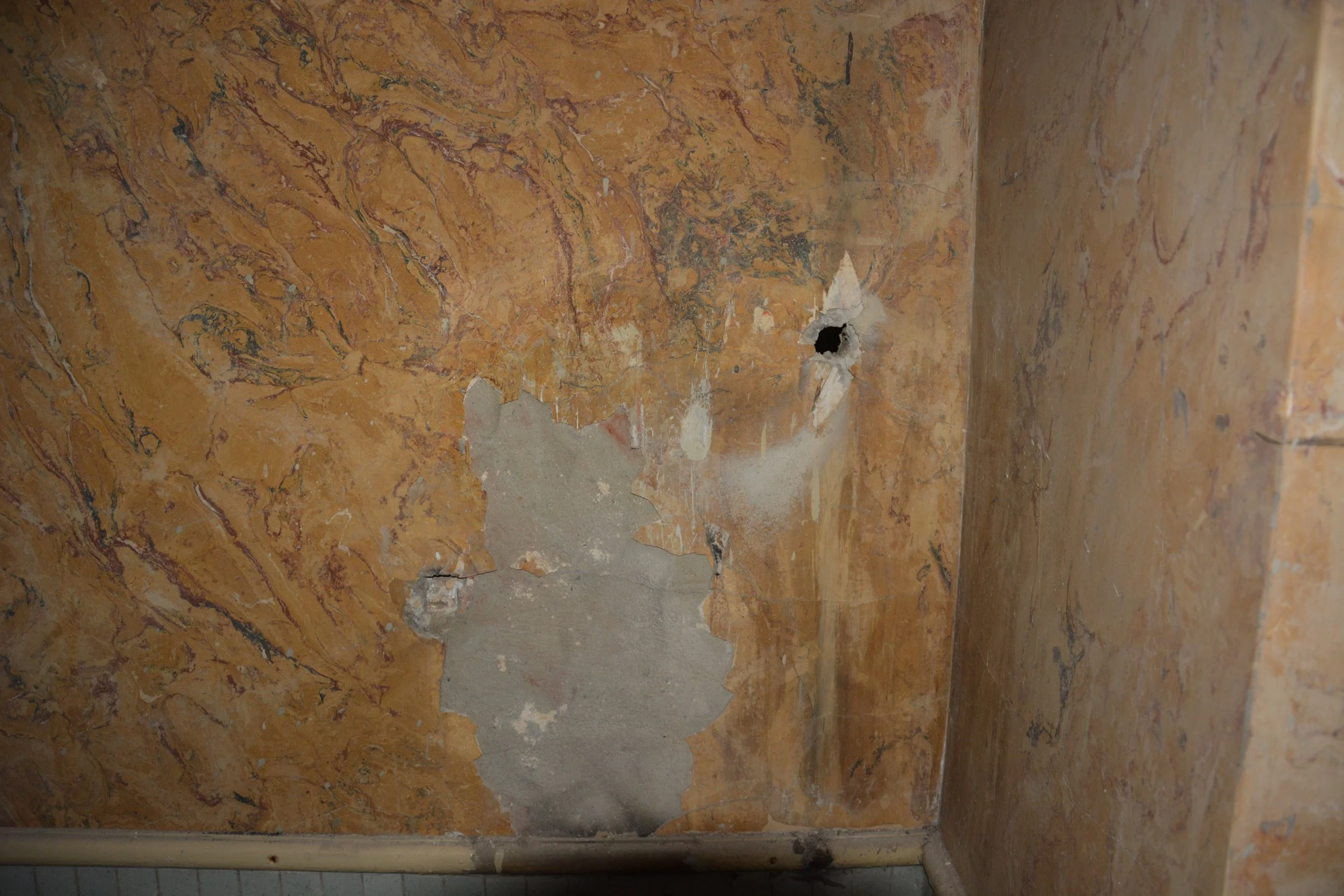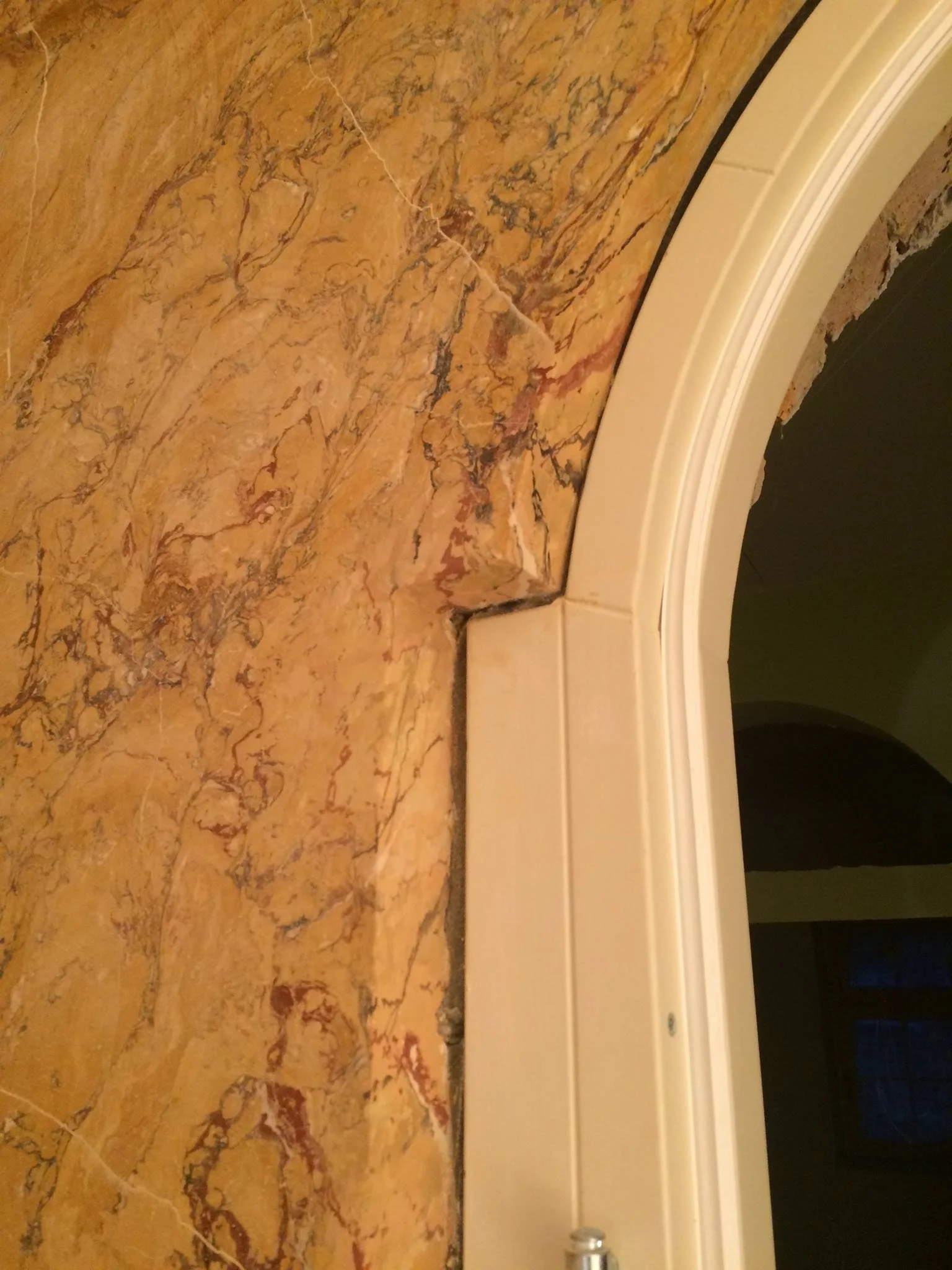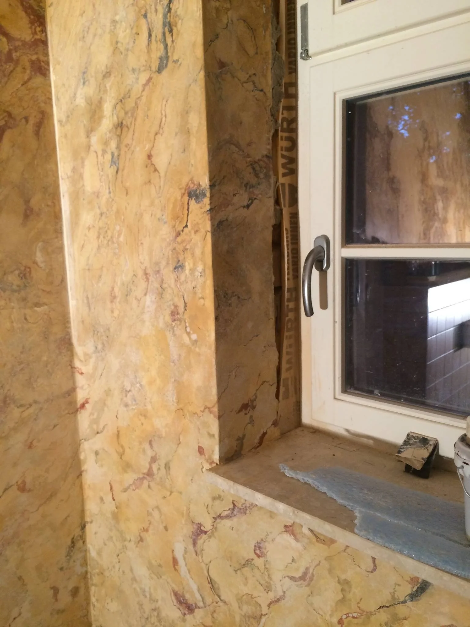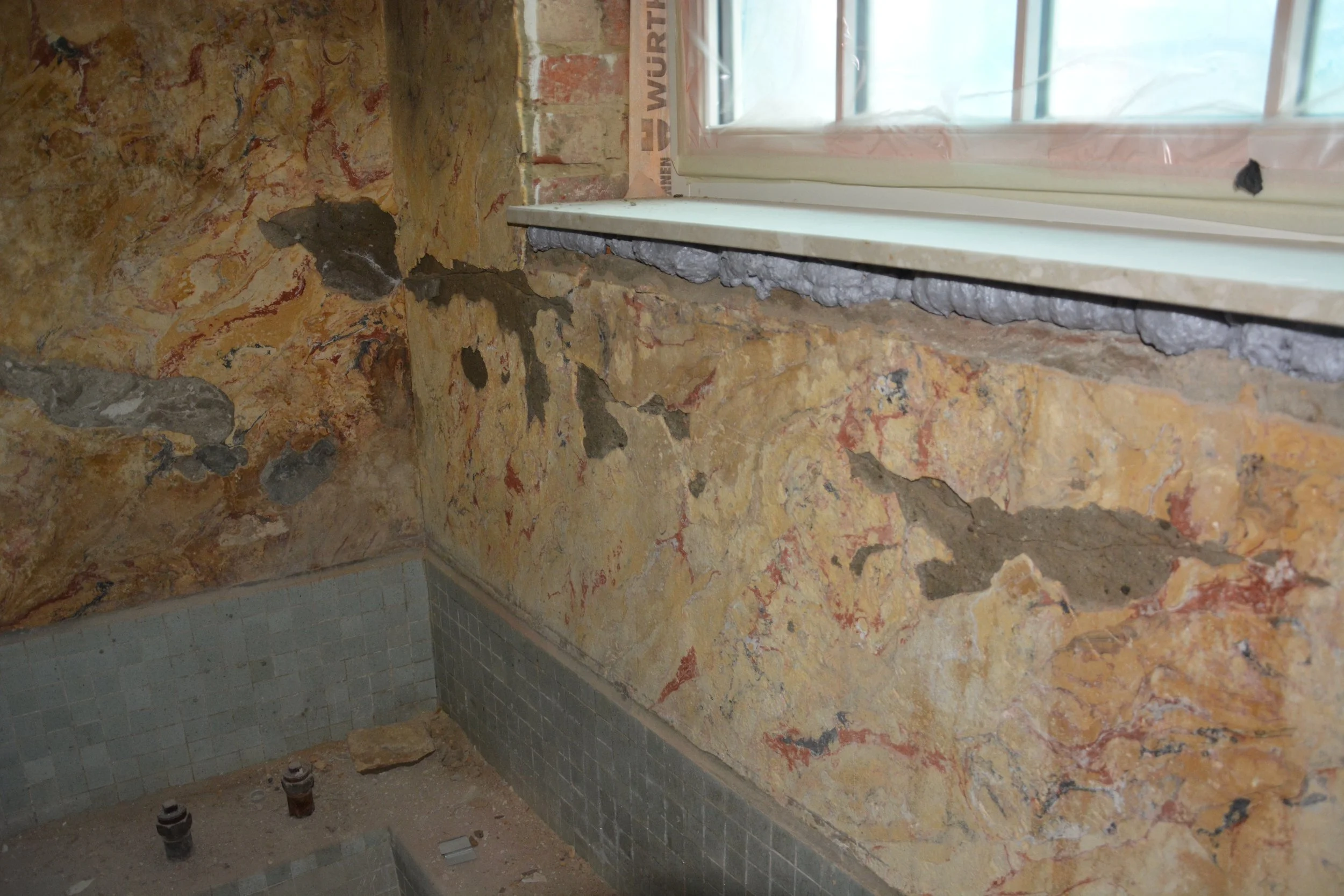 Wittekind (Halle), Bauhistorisches Gutachten, Teilrekonstruktion der Schäden durch Einbau der neuen Fenster und Türen, sowie der Nässeschäden am Stuckmarmor, Aufarbeitung, wachsen und polieren des vorhandenen Stuckmarmors